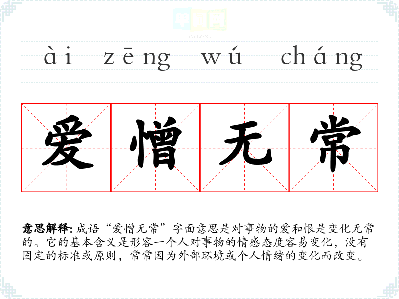 成语“爱憎无常”字面意思是对事物的爱和恨是变化无常的。它的基本含义是形容一个人对事物的情感态度容易变化,没有固定的标准或原则,常常因为外部环境或个人情绪的变化而改变。
