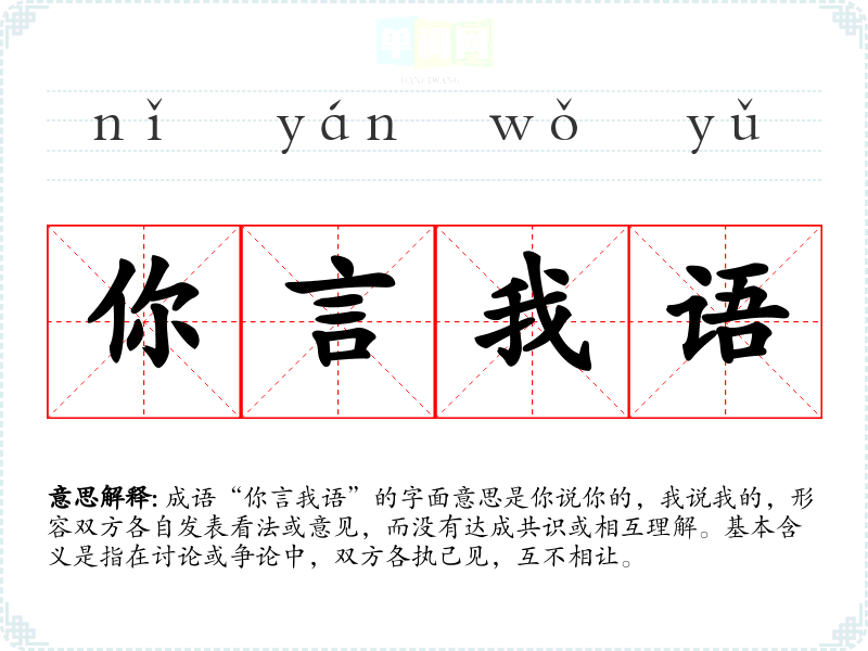 成语“你言我语”的字面意思是你说你的,我说我的,形容双方各自发表看法或意见,而没有达成共识或相互理解。基本含义是指在讨论或争论中,双方各执己见,互不相让。