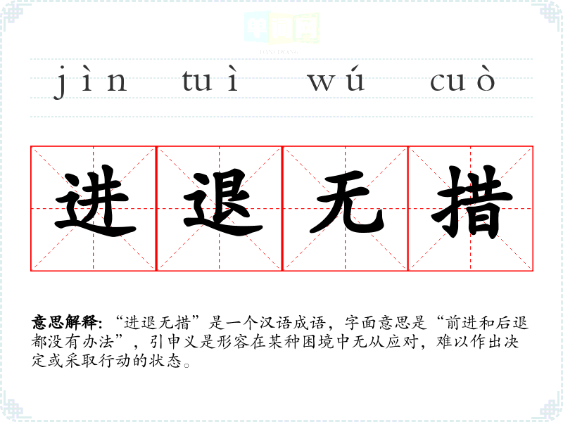 “进退无措”是一个汉语成语,字面意思是“前进和后退都没有办法”,引申义是形容在某种困境中无从应对,难以作出决定或采取行动的状态。