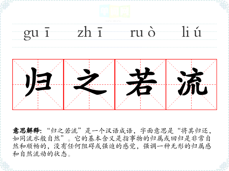 “归之若流”是一个汉语成语,字面意思是“将其归还,如同流水般自然”。它的基本含义是指事物的归属或回归是非常自然和顺畅的,没有任何阻碍或强迫的感觉,强调一种无形的归属感和自然流动的状态。