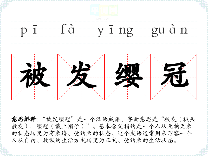 “被发缨冠”是一个汉语成语,字面意思是“被发(披头散发)、缨冠(戴上帽子)”。基本含义指的是一个人从无拘无束的状态转变为有束缚、受约束的状态。这个成语通常用来形容一个人从自由、放纵的生活方式转变为正式、受约束的生活状态。