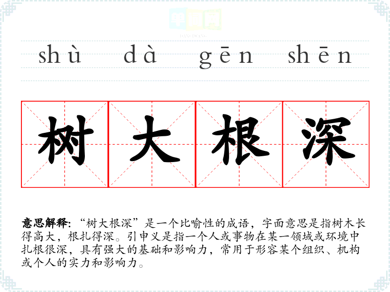 “树大根深”是一个比喻性的成语,字面意思是指树木长得高大,根扎得深。引申义是指一个人或事物在某一领域或环境中扎根很深,具有强大的基础和影响力,常用于形容某个组织、机构或个人的实力和影响力。