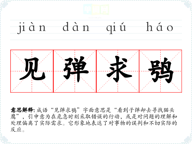 成语“见弹求鸮”字面意思是“看到子弹却去寻找猫头鹰”,引申意为在危急时刻采取错误的行动,或是对问题的理解和处理偏离了实际需求。它形象地表达了对事物的误判和不切实际的反应。