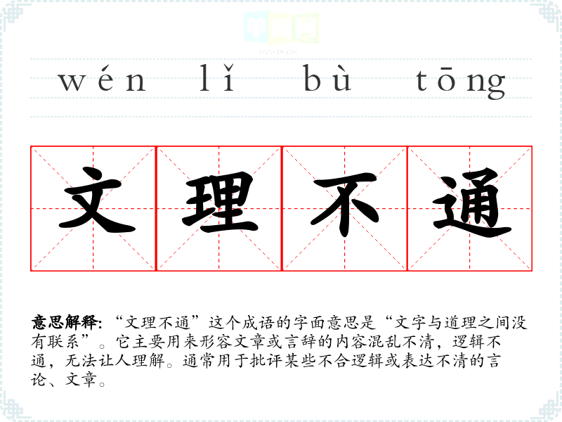 “文理不通”这个成语的字面意思是“文字与道理之间没有联系”。它主要用来形容文章或言辞的内容混乱不清,逻辑不通,无法让人理解。通常用于批评某些不合逻辑或表达不清的言论、文章。