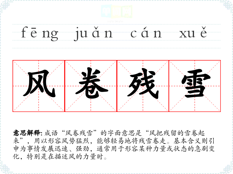 成语“风卷残雪”的字面意思是“风把残留的雪卷起来”,用以形容风势猛烈,能够轻易地将残雪卷走。基本含义则引申为事情发展迅速、强劲,通常用于形容某种力量或状态的急剧变化,特别是在描述风的力量时。