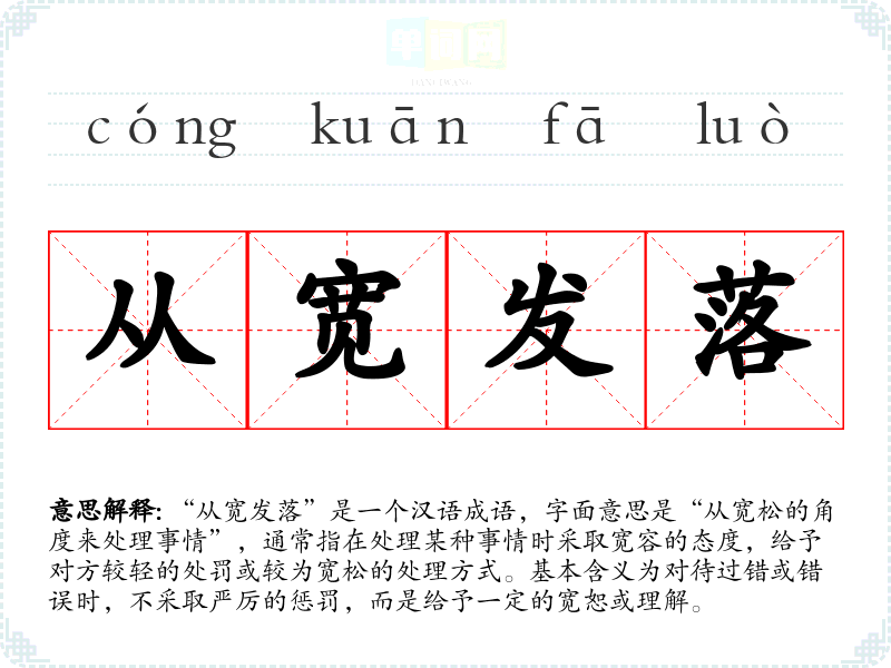 “从宽发落”是一个汉语成语,字面意思是“从宽松的角度来处理事情”,通常指在处理某种事情时采取宽容的态度,给予对方较轻的处罚或较为宽松的处理方式。基本含义为对待过错或错误时,不采取严厉的惩罚,而是给予一定的宽恕或理解。