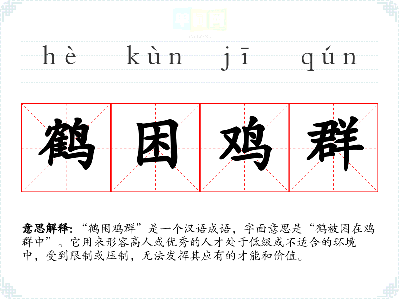 “鹤困鸡群”是一个汉语成语,字面意思是“鹤被困在鸡群中”。它用来形容高人或优秀的人才处于低级或不适合的环境中,受到限制或压制,无法发挥其应有的才能和价值。