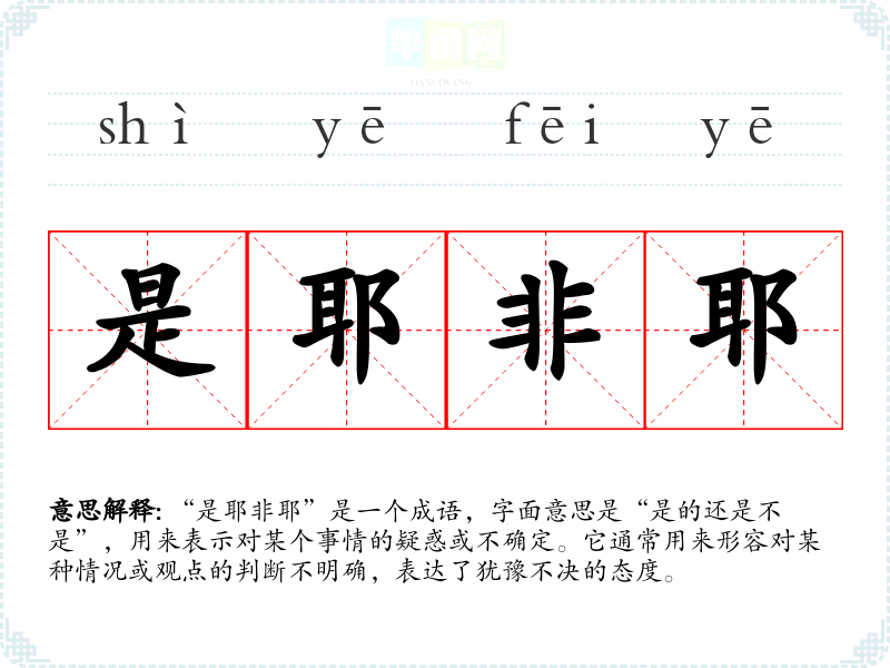 “是耶非耶”是一个成语,字面意思是“是的还是不是”,用来表示对某个事情的疑惑或不确定。它通常用来形容对某种情况或观点的判断不明确,表达了犹豫不决的态度。