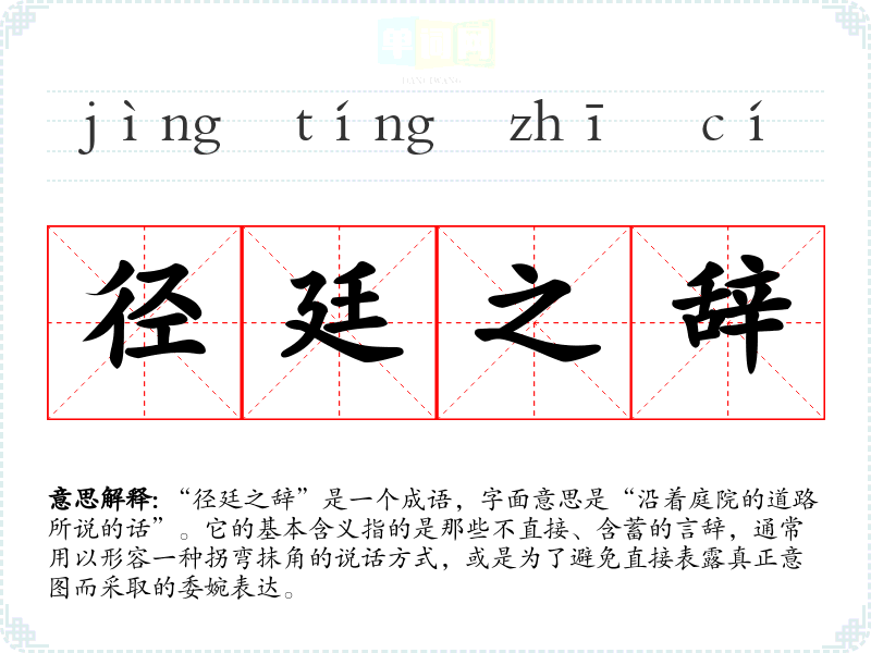 “径廷之辞”是一个成语,字面意思是“沿着庭院的道路所说的话”。它的基本含义指的是那些不直接、含蓄的言辞,通常用以形容一种拐弯抹角的说话方式,或是为了避免直接表露真正意图而采取的委婉表达。