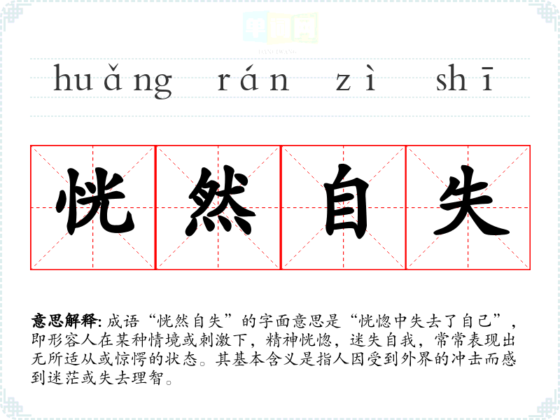 成语“恍然自失”的字面意思是“恍惚中失去了自己”,即形容人在某种情境或刺激下,精神恍惚,迷失自我,常常表现出无所适从或惊愕的状态。其基本含义是指人因受到外界的冲击而感到迷茫或失去理智。