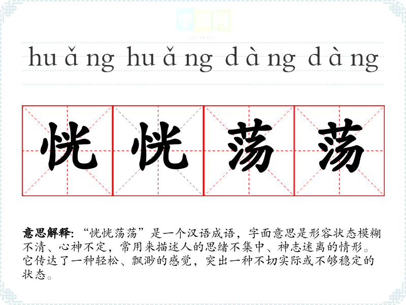 “恍恍荡荡”是一个汉语成语,字面意思是形容状态模糊不清、心神不定,常用来描述人的思绪不集中、神志迷离的情形。它传达了一种轻松、飘渺的感觉,突出一种不切实际或不够稳定的状态。