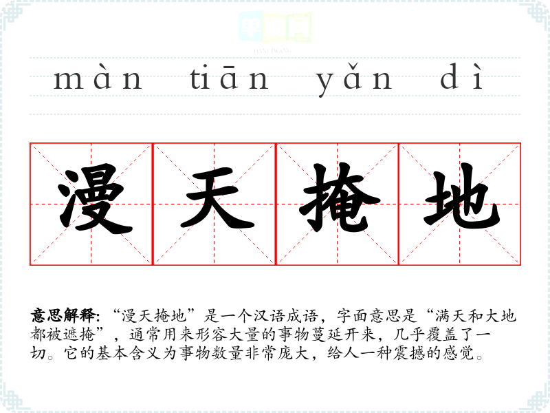 “漫天掩地”并没有确切的历史典故,但可以理解为一种形象的描绘,可能源自于对自然现象或者战争场景的描述。成语中的“漫天”指的是天空的广阔,“掩地”则强调地面的覆盖,两个词结合起来,形成了一种极为夸张和生动的视觉效果。