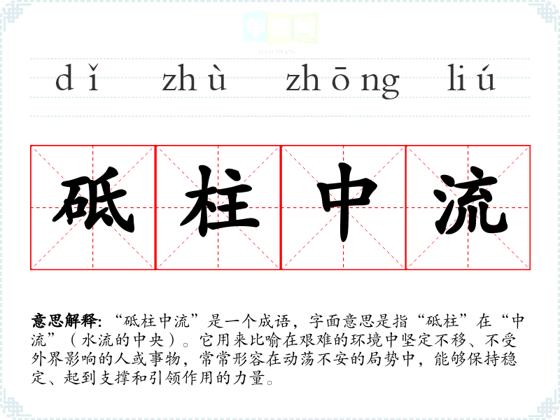 “砥柱中流”是一个成语,字面意思是指“砥柱”在“中流”(水流的中央)。它用来比喻在艰难的环境中坚定不移、不受外界影响的人或事物,常常形容在动荡不安的局势中,能够保持稳定、起到支撑和引领作用的力量。