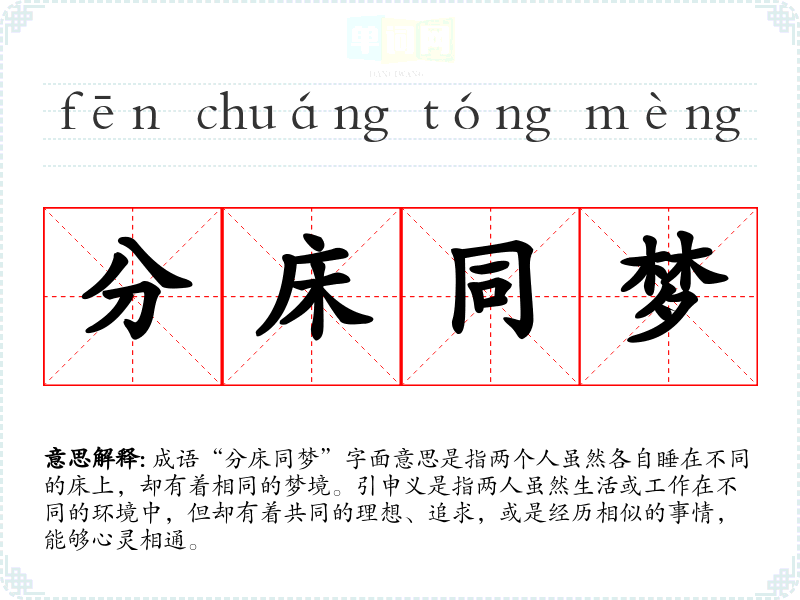 成语“分床同梦”字面意思是指两个人虽然各自睡在不同的床上,却有着相同的梦境。引申义是指两人虽然生活或工作在不同的环境中,但却有着共同的理想、追求,或是经历相似的事情,能够心灵相通。