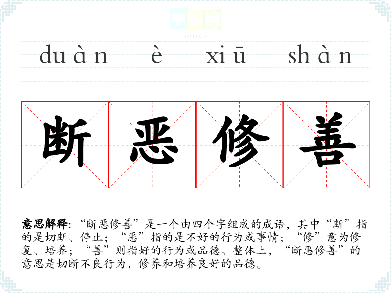 “断恶修善”是一个由四个字组成的成语,其中“断”指的是切断、停止;“恶”指的是不好的行为或事情;“修”意为修复、培养;“善”则指好的行为或品德。整体上,“断恶修善”的意思是切断不良行为,修养和培养良好的品德。