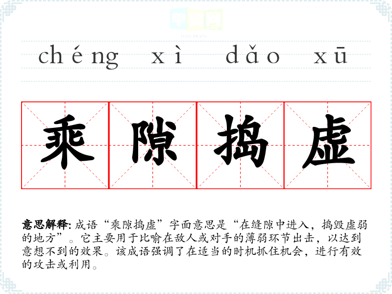 通过对“乘隙捣虚”的学,我认识到善于观察和把握时机的重要性。这不仅在军事战略中适用,也能广泛应用于生活的各个方面。在语言学和表达中,掌握这样的成语可以丰富我的表达方式,使其更加生动和有力。