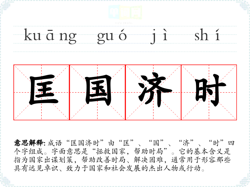 成语“匡国济时”由“匡”、“国”、“济”、“时”四个字组成。字面意思是“拯救国家,帮助时局”。它的基本含义是指为国家出谋划策,帮助改善时局、解决困难,通常用于形容那些具有远见卓识、致力于国家和社会发展的杰出人物或行动。