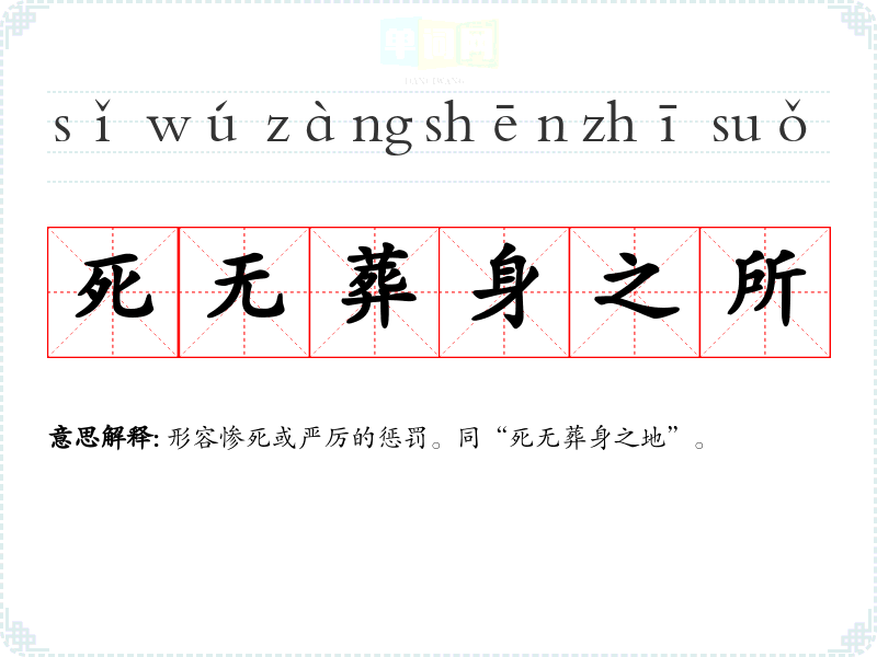| 死无葬身之所 | 形容惨死或严厉的惩罚。同“死无葬身之地”。 |