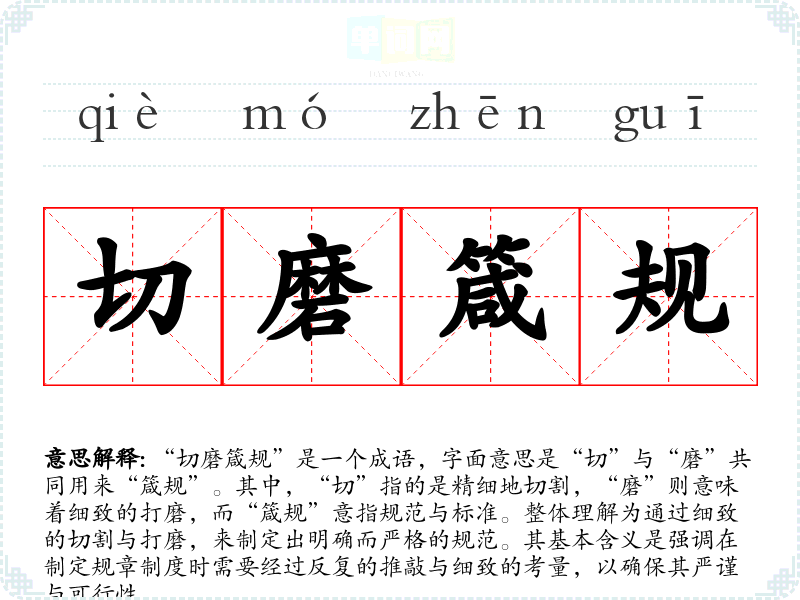 “切磨箴规”是一个成语,字面意思是“切”与“磨”共同用来“箴规”。其中,“切”指的是精细地切割,“磨”则意味着细致的打磨,而“箴规”意指规范与标准。整体理解为通过细致的切割与打磨,来制定出明确而严格的规范。其基本含义是强调在制定规章制度时需要经过反复的推敲与细致的考量,以确保其严谨与可行性。