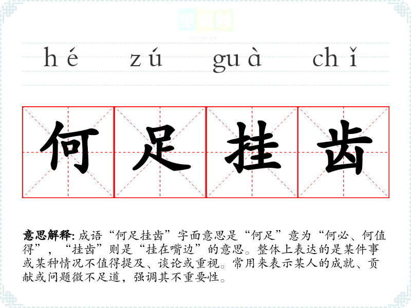 成语“何足挂齿”字面意思是“何足”意为“何必、何值得”,“挂齿”则是“挂在嘴边”的意思。整体上表达的是某件事或某种情况不值得提及、谈论或重视。常用来表示某人的成就、贡献或问题微不足道,强调其不重要性。