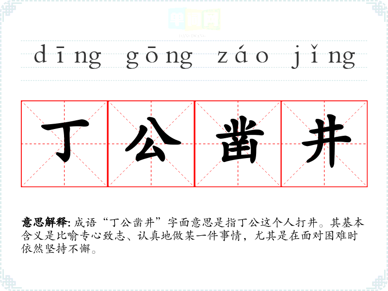 成语“丁公凿井”字面意思是指丁公这个人打井。其基本含义是比喻专心致志、认真地做某一件事情,尤其是在面对困难时依然坚持不懈。