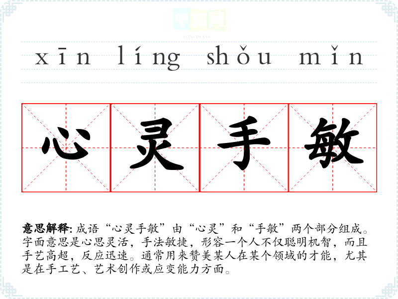 成语“心灵手敏”由“心灵”和“手敏”两个部分组成。字面意思是心思灵活,手法敏捷,形容一个人不仅聪明机智,而且手艺高超,反应迅速。通常用来赞美某人在某个领域的才能,尤其是在手工艺、艺术创作或应变能力方面。