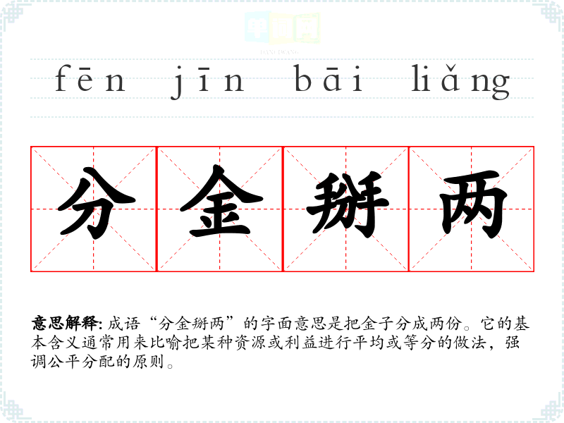 成语“分金掰两”的字面意思是把金子分成两份。它的基本含义通常用来比喻把某种资源或利益进行平均或等分的做法,强调公平分配的原则。