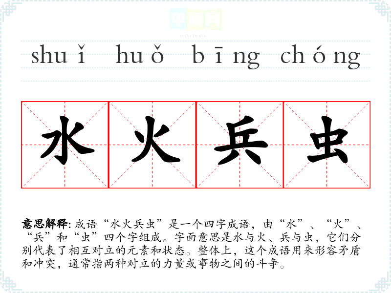 成语“水火兵虫”是一个四字成语,由“水”、“火”、“兵”和“虫”四个字组成。字面意思是水与火、兵与虫,它们分别代表了相互对立的元素和状态。整体上,这个成语用来形容矛盾和冲突,通常指两种对立的力量或事物之间的斗争。