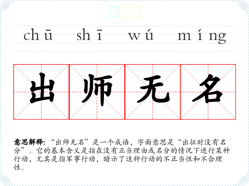 “出师无名”是一个成语,字面意思是“出征时没有名分”。它的基本含义是指在没有正当理由或名分的情况下进行某种行动,尤其是指军事行动,暗示了这种行动的不正当性和不合理性。