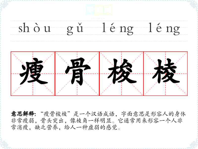 “瘦骨梭棱”是一个汉语成语,字面意思是形容人的身体非常瘦弱,骨头突出,像棱角一样明显。它通常用来形容一个人非常消瘦,缺乏营养,给人一种虚弱的感觉。