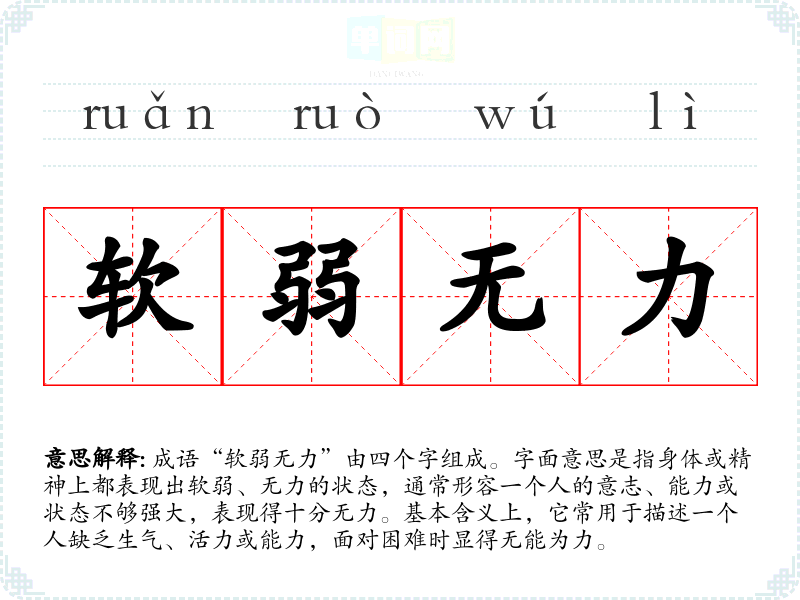 - 日常对话:在朋友间的闲聊中,可能会用来描述一个人对某件事情的无能为力,比如:“面对如此复杂的问题,我感觉自己真是软弱无力。”