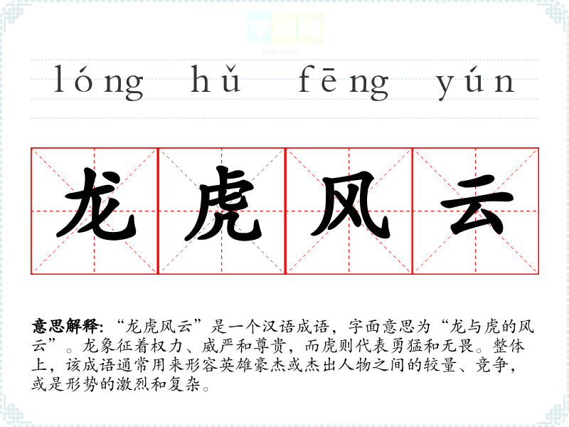 “龙虎风云”是一个汉语成语,字面意思为“龙与虎的风云”。龙象征着权力、威严和尊贵,而虎则代表勇猛和无畏。整体上,该成语通常用来形容英雄豪杰或杰出人物之间的较量、竞争,或是形势的激烈和复杂。