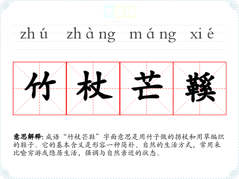 成语“竹杖芒鞋”字面意思是用竹子做的拐杖和用草编织的鞋子。它的基本含义是形容一种简朴、自然的生活方式,常用来比喻穷游或隐居生活,强调与自然亲近的状态。