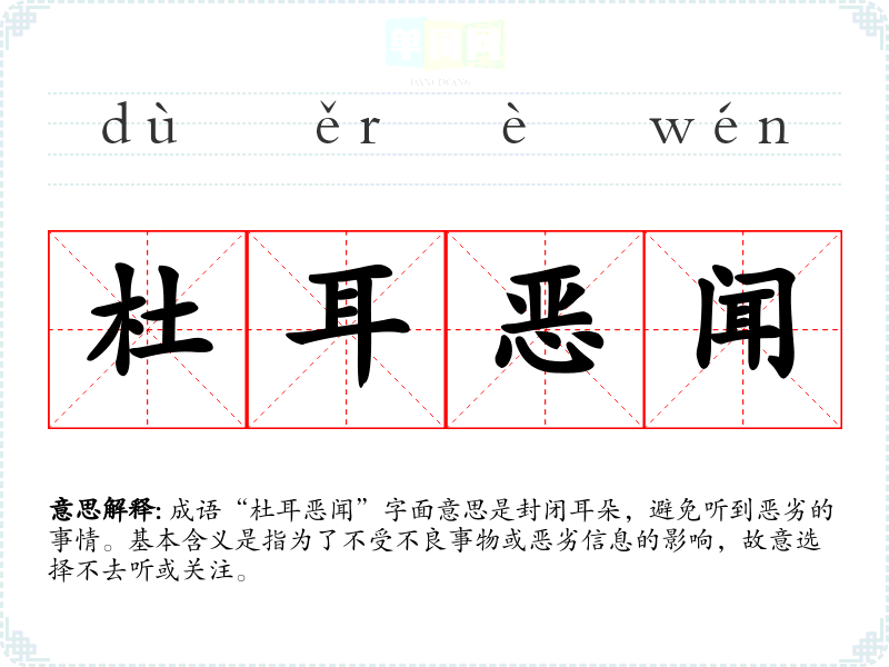 成语“杜耳恶闻”字面意思是封闭耳朵,避免听到恶劣的事情。基本含义是指为了不受不良事物或恶劣信息的影响,故意选择不去听或关注。