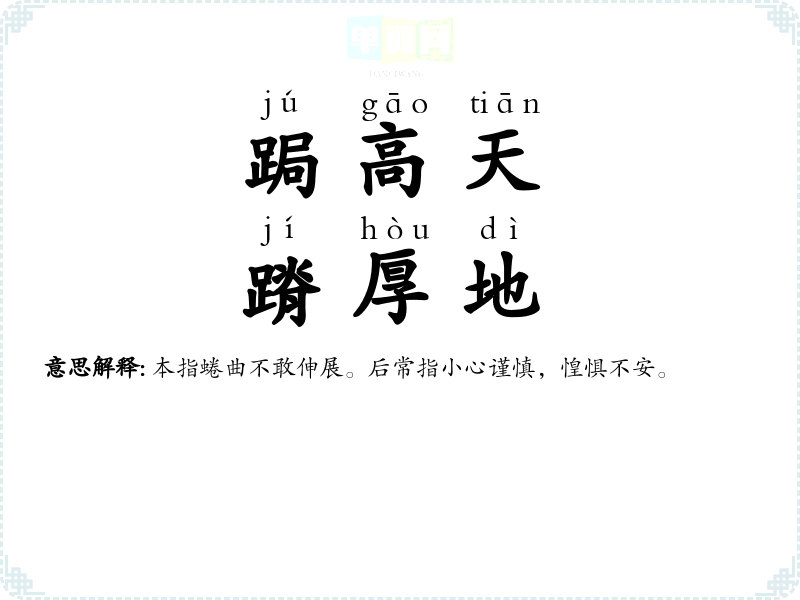 | 跼高天,蹐厚地 | 本指蜷曲不敢伸展。后常指小心谨慎,惶惧不安。 |