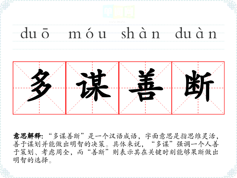 “多谋善断”是一个汉语成语,字面意思是指思维灵活,善于谋划并能做出明智的决策。具体来说,“多谋”强调一个人善于策划、考虑周全,而“善断”则表示其在关键时刻能够果断做出明智的选择。