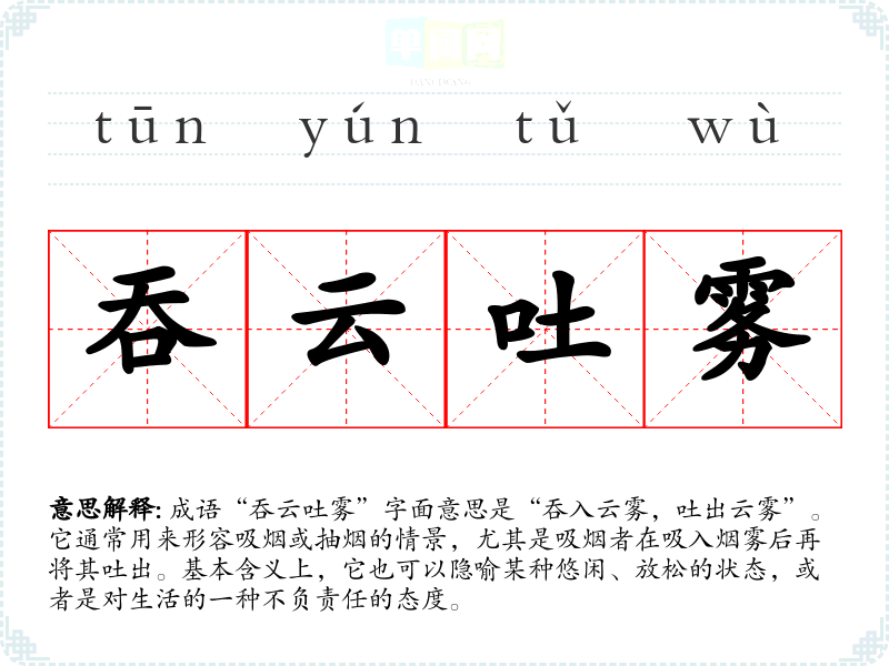 成语“吞云吐雾”字面意思是“吞入云雾,吐出云雾”。它通常用来形容吸烟或抽烟的情景,尤其是吸烟者在吸入烟雾后再将其吐出。基本含义上,它也可以隐喻某种悠闲、放松的状态,或者是对生活的一种不负责任的态度。
