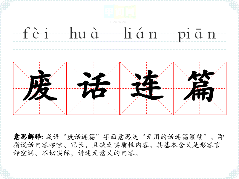 “废话连篇”并没有明确的历史典故或文学出处,它是一种现代汉语的表达方式。这个成语的构成中,“废话”通常指无意义或多余的话,而“连篇”则强调了这种话语的数量多,形成一篇又一篇。它反映了现代社会中对简洁、高效沟通的需求。