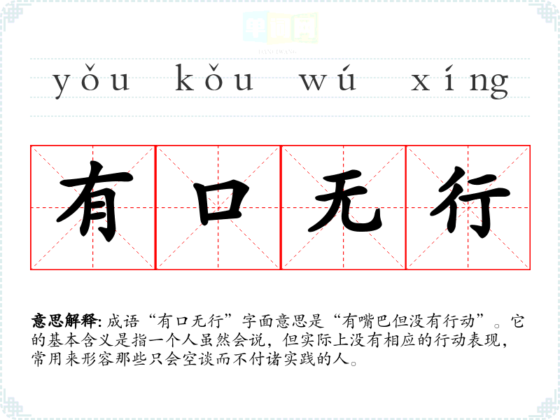 成语“有口无行”字面意思是“有嘴巴但没有行动”。它的基本含义是指一个人虽然会说,但实际上没有相应的行动表现,常用来形容那些只会空谈而不付诸实践的人。