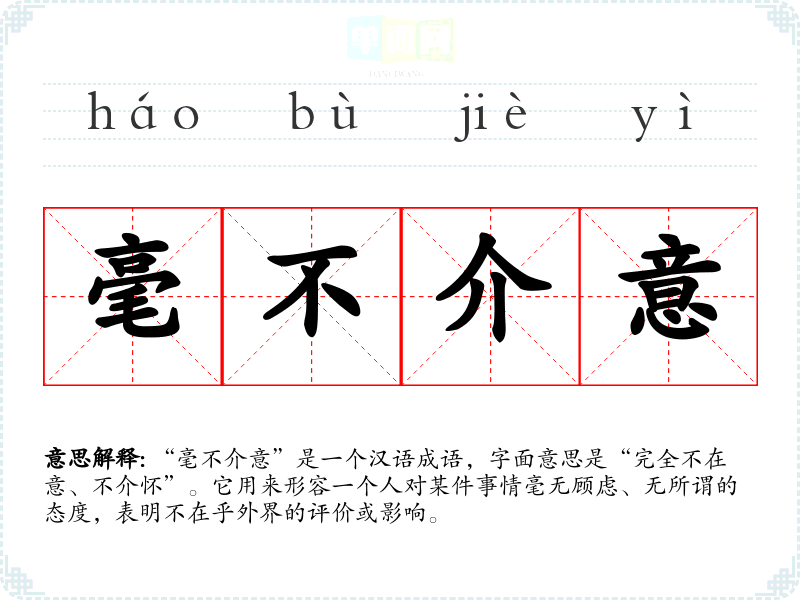 “毫不介意”是一个汉语成语,字面意思是“完全不在意、不介怀”。它用来形容一个人对某件事情毫无顾虑、无所谓的态度,表明不在乎外界的评价或影响。