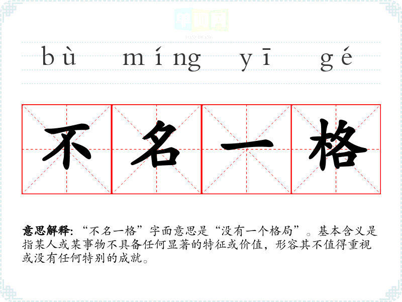 “不名一格”字面意思是“没有一个格局”。基本含义是指某人或某事物不具备任何显著的特征或价值,形容其不值得重视或没有任何特别的成就。