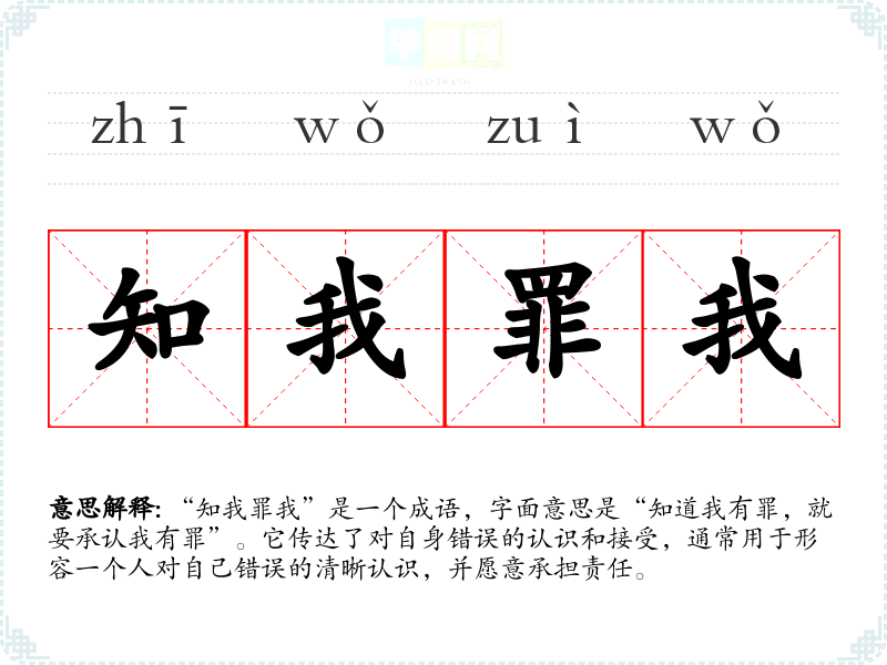 “知我罪我”是一个成语,字面意思是“知道我有罪,就要承认我有罪”。它传达了对自身错误的认识和接受,通常用于形容一个人对自己错误的清晰认识,并愿意承担责任。