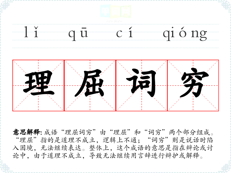 成语“理屈词穷”由“理屈”和“词穷”两个部分组成。“理屈”指的是道理不成立,逻辑上不通;“词穷”则是说话时陷入困境,无法继续表达。整体上,这个成语的意思是指在辩论或讨论中,由于道理不成立,导致无法继续用言辞进行辩护或解释。