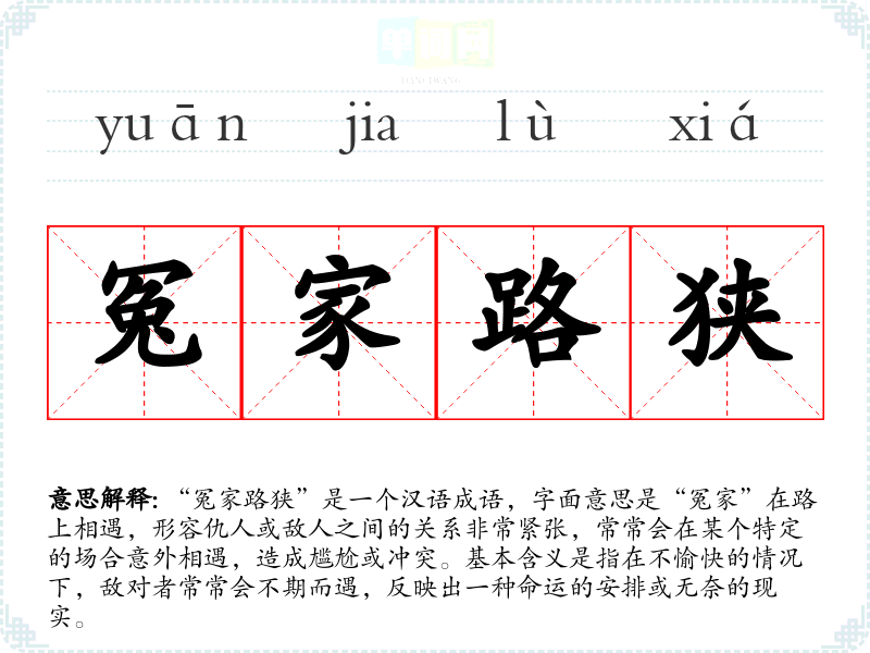 “冤家路狭”是一个汉语成语,字面意思是“冤家”在路上相遇,形容仇人或敌人之间的关系非常紧张,常常会在某个特定的场合意外相遇,造成尴尬或冲突。基本含义是指在不愉快的情况下,敌对者常常会不期而遇,反映出一种命运的安排或无奈的现实。
