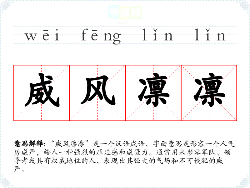 “威风凛凛”是一个汉语成语,字面意思是形容一个人气势威严,给人一种强烈的压迫感和威慑力。通常用来形容军队、领导者或具有权威地位的人,表现出其强大的气场和不可侵犯的威严。