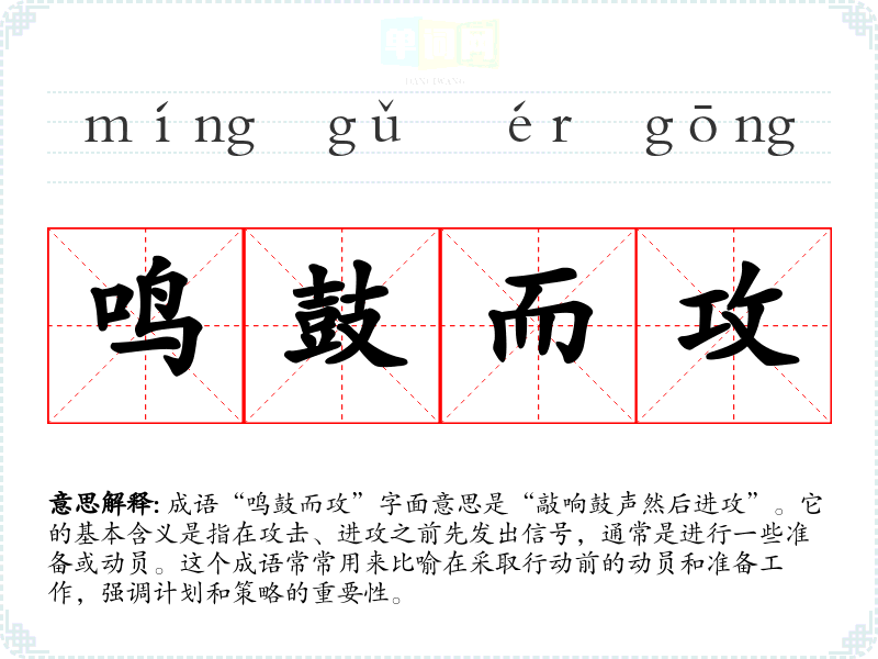 成语“鸣鼓而攻”字面意思是“敲响鼓声然后进攻”。它的基本含义是指在攻击、进攻之前先发出信号,通常是进行一些准备或动员。这个成语常常用来比喻在采取行动前的动员和准备工作,强调计划和策略的重要性。