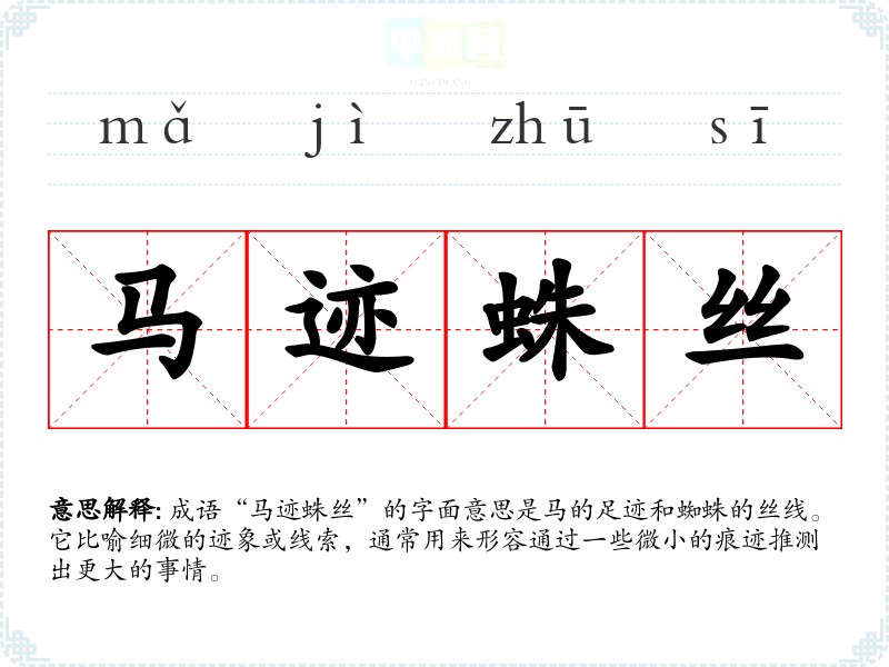 成语“马迹蛛丝”的字面意思是马的足迹和蜘蛛的丝线。它比喻细微的迹象或线索,通常用来形容通过一些微小的痕迹推测出更大的事情。