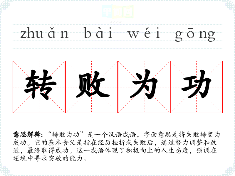 在*文化中,成功常被视为努力与坚持的结果,而失败则被看作是学与成长的机会。因此,“转败为功”体现了**社会对失败的宽容和对成功的渴望。现代社会尤其强调创新与应变能力,“转败为功”这一成语在创业、职场发展等领域的适用性愈发明显。