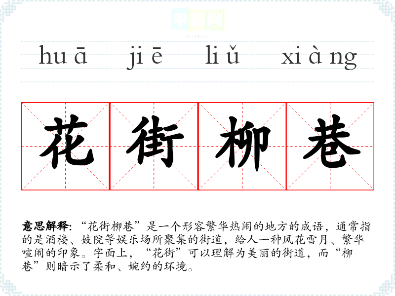 “花街柳巷”是一个形容繁华热闹的地方的成语,通常指的是酒楼、妓院等娱乐场所聚集的街道,给人一种风花雪月、繁华喧闹的印象。字面上,“花街”可以理解为美丽的街道,而“柳巷”则暗示了柔和、婉约的环境。