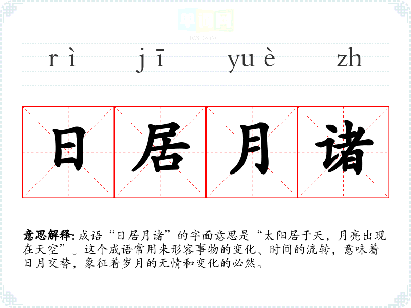 成语“日居月诸”的字面意思是“太阳居于天,月亮出现在天空”。这个成语常用来形容事物的变化、时间的流转,意味着日月交替,象征着岁月的无情和变化的必然。